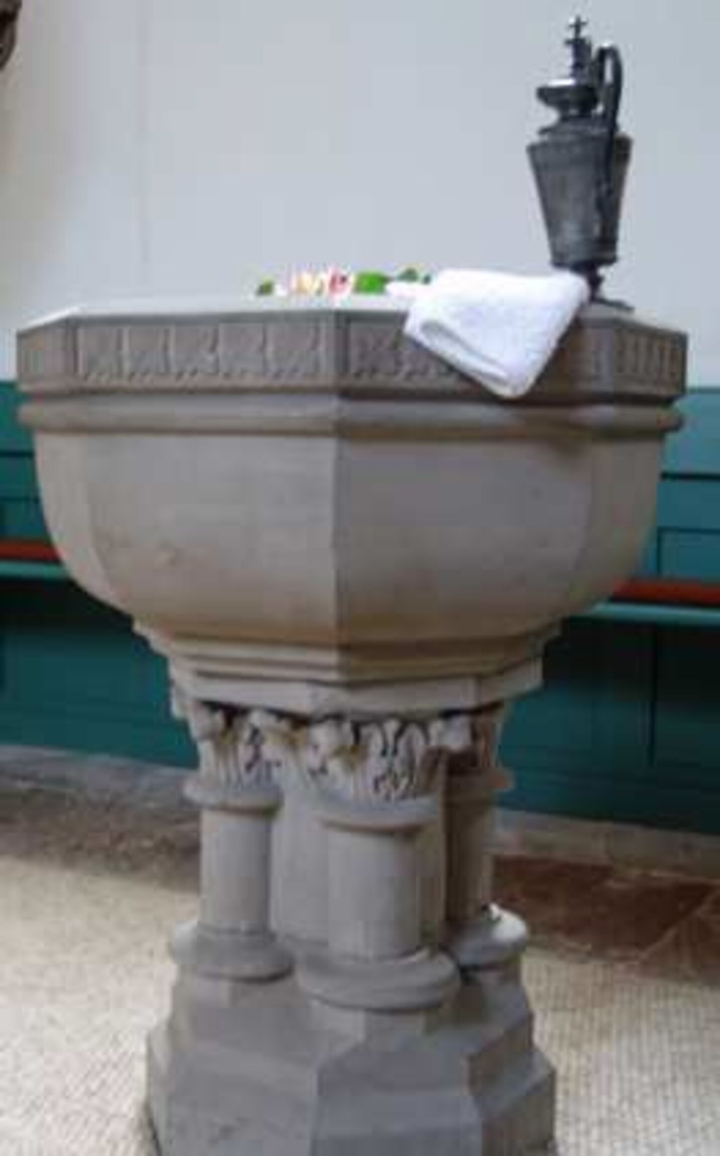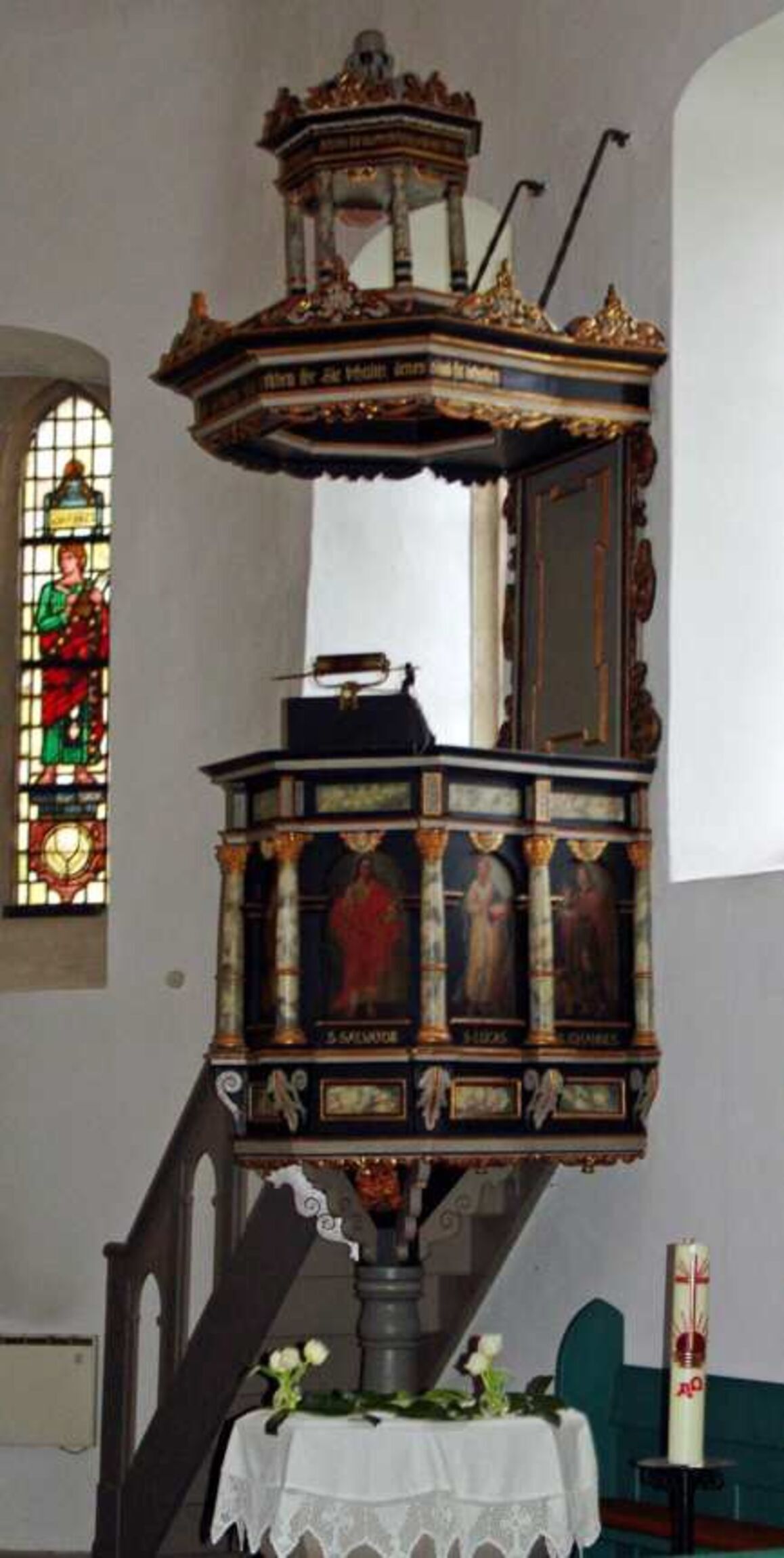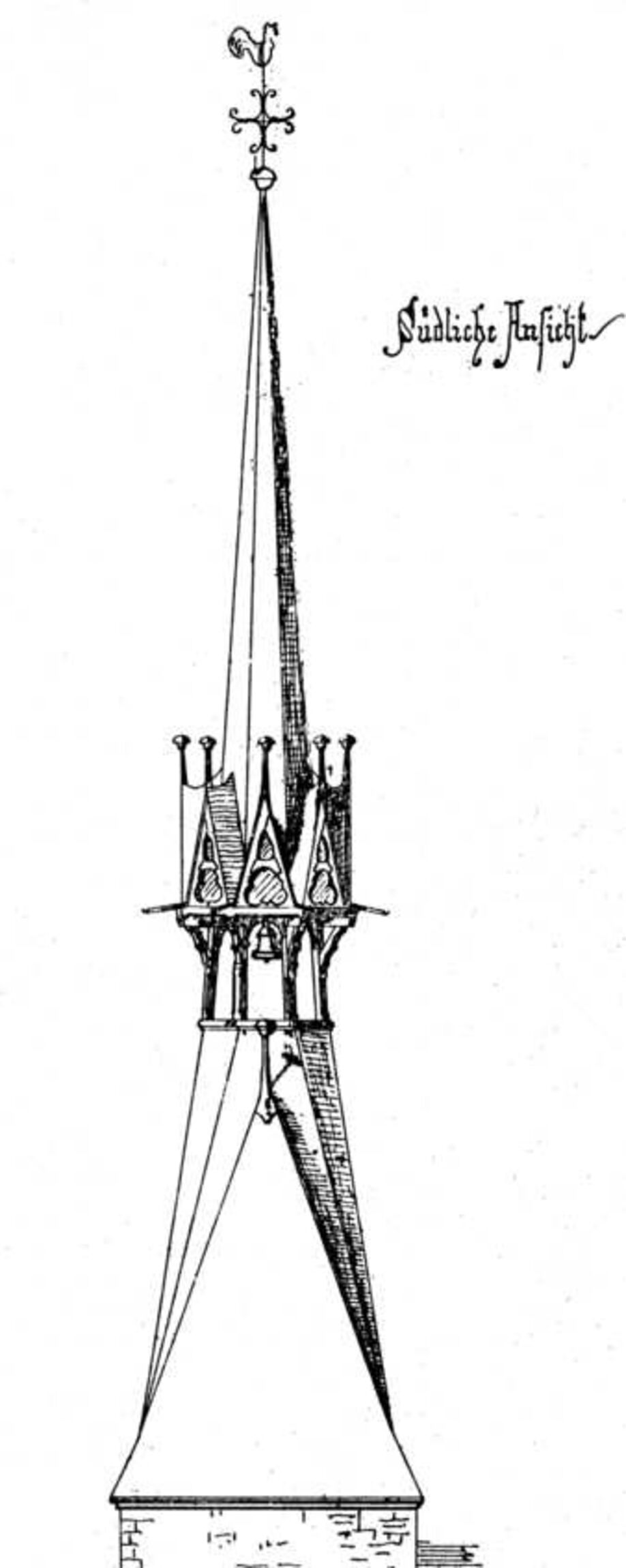 Die alte, eiserne Uhrschlagglocke von 1918 steht vor dem Gemeindehaus. Oberhalb der Glockenstube führen Stiegen und Leitern hoch hinauf bis an die Spitze des Turmhelmes. Der Turmhelm selbst kann von innen – aus verständlichen Gründen – nicht besichtigt werden. Wir können ihn jedoch von außen betrachten: